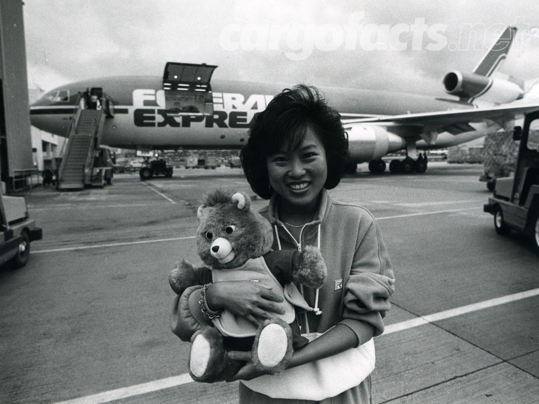 In 1985 Federal Express did not have much of a presence in Asia, so it is likely that some Teddy Ruxpins are connecting here from another carrier, possibly Flying Tigers, which had a large presence in Hong Kong at the time. It’s hard to tell but the aircraft appears to be numbered “305” – probably N305FE (msn: 47870), a DC-10-30F originally built for Lauda Air in 1980 but not taken up, and then delivered essentially new to FedEx in September, 1984.