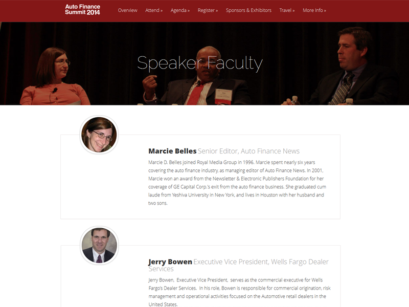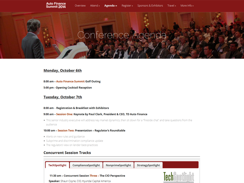 The 2014 event was the seventh Auto Finance Summit for which I designed the visuals. In 2012, I designed a brand new web presence for the event that scrolled vertically through the major elements of the conference, presenting each element visually and inviting the user to experience more. The interface was an early mobile-first design. Original photography of past events was deeply incorporated into the experience, to provide guests and potential attendees with a look at what the event is like from a first-hand point of view.