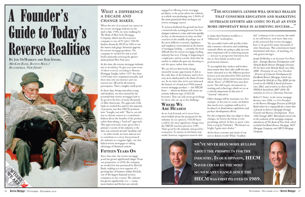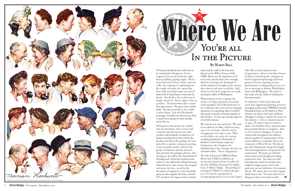Reverse Mortgage was a publication produced for the National Reverese Mortgage Lender’s Association. Focused exclusively on the Reverse Mortgage Industry, it often focused on meeting the needs of seniors and ensuring the quality and honesty of the industry as a whole. This special “Retro” issue licensed a cover by Norman Rockwell, which appeared in modified form. The goal was to make the issue appear like a 1940’s issue of The Saturday Evening Post while retaining the basics of the regular magazine, The interior featured other vintage illustrations by Rockwell – all in the public domain – and his contemporary, J. C. Leyendecker, to keep with the theme. |